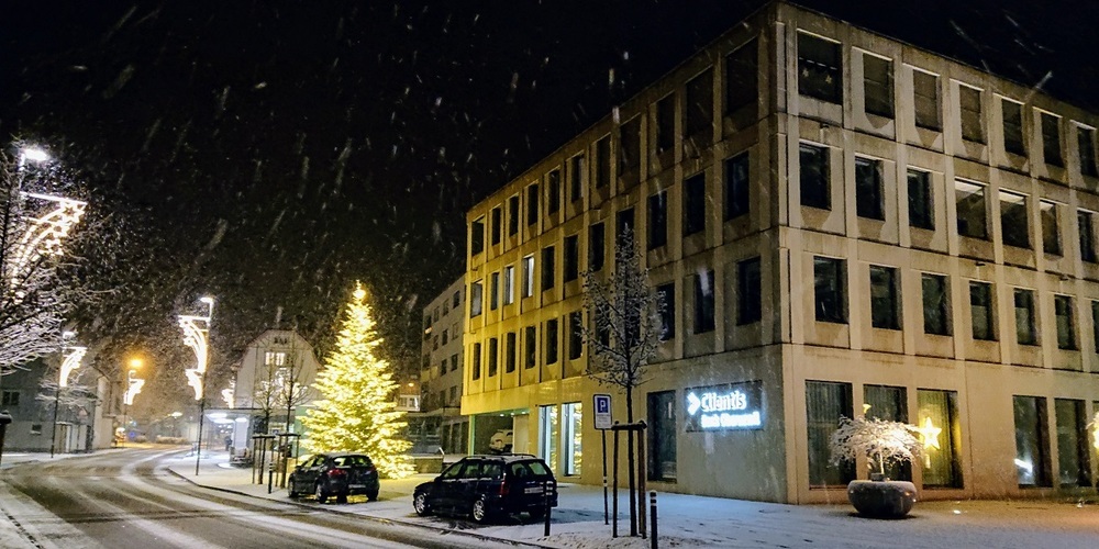 Der neun Meter hoher Christbaum - geschlagen, transportiert und aufgestellt von Blumen Nützi - sorgt vor dem Eingang zur Clientis Bank Oberuzwil für Advents- und Weihnachtsstimmung.