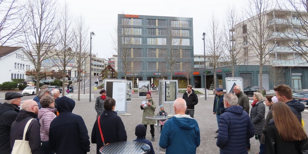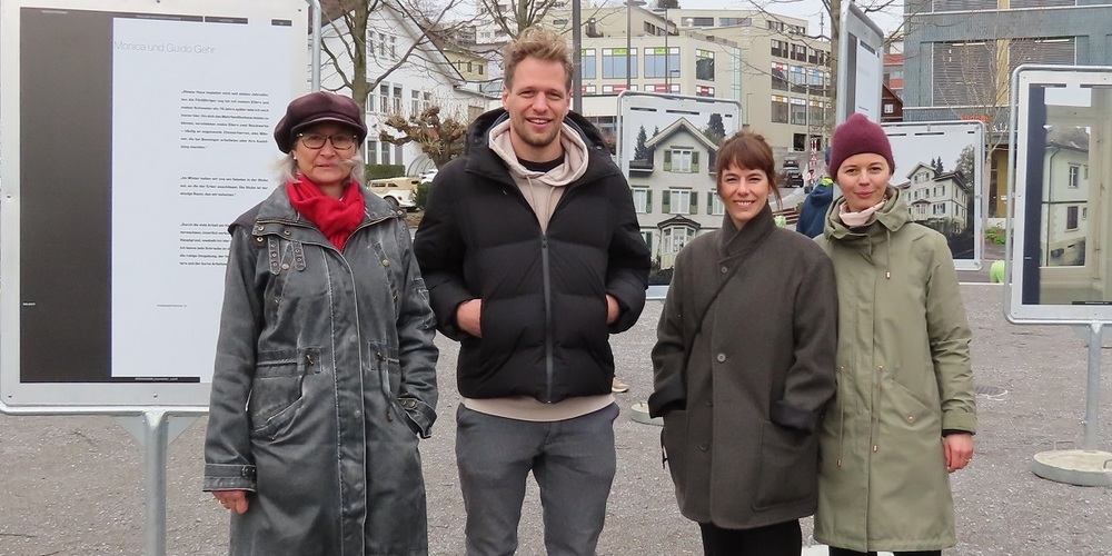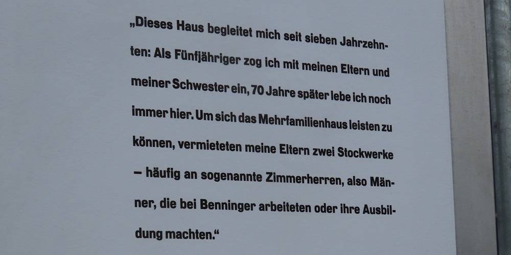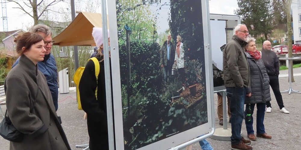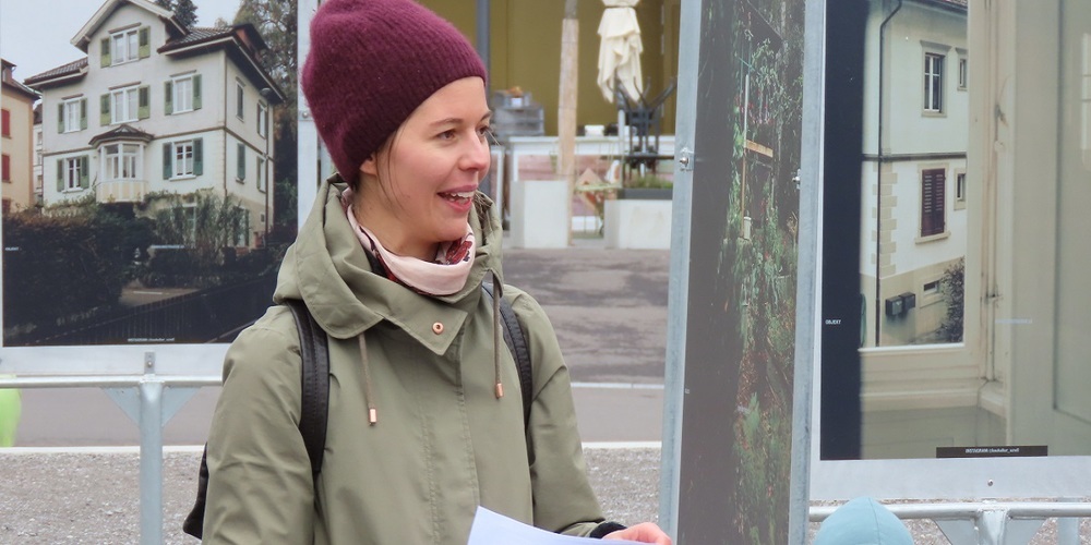 Überraschende Einblicke in eine beim Vorbeifahren kaum erwartete Idylle des Hauses an der Konsumstrasse 13. Im Plakat und rechts davon: die Eigentümer Monica und Guido Gehr (siehe Videoclip weiter unten).