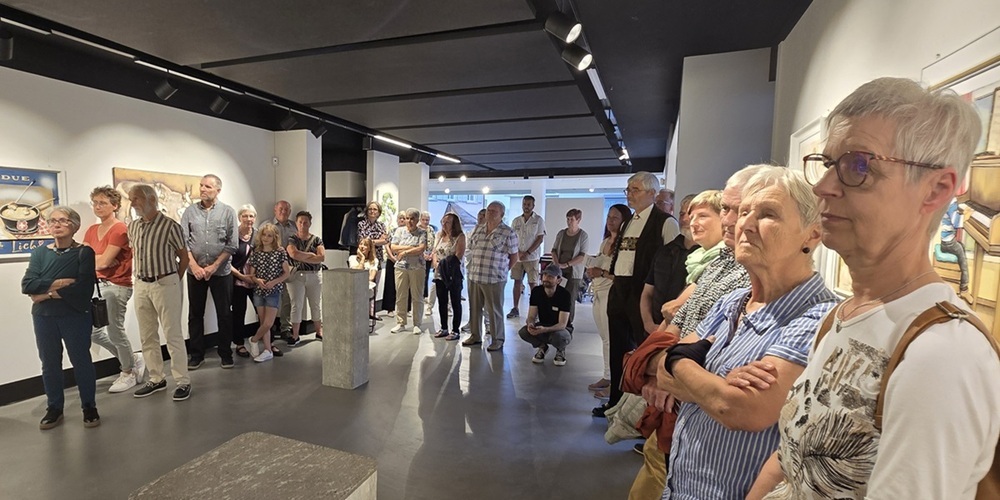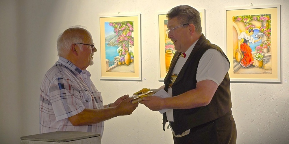 Nach der Begrüssung durch Zinta Okle (Galerie am Gleis) gab Stefan Hobi in seiner Laudatio einen Einblick in das Leben von Walter Järmann als Maler und Kunstmaler (Link dazu weiter unten). Als Präsident des Jodlerclubs Uzwil erschien Hobi zu Ehren von Walter Järmann in der Toggenburger Sonntagstracht. Er zog in seiner kurzweiligen Lobrede auch schnell den Bogen zwischen dem Jodlerclub und Walter Järmann. Bekannt für Gemälde in fast jeder Grösse hatte Järmann zum 100-Jahr-Jubiläum des Jodlerclubs ein neues Alpstein-Bühnenbild in der Grösse von rund 50 Quadratmetern gemalt. Dieses könne man, so Hobi mit einem kleinen sympatischen Werbespot in eigener Sache, am Jodlerabend vom 30. November 2024 im Gemeindesaal Uzwil, ebenfalls bestaunen.