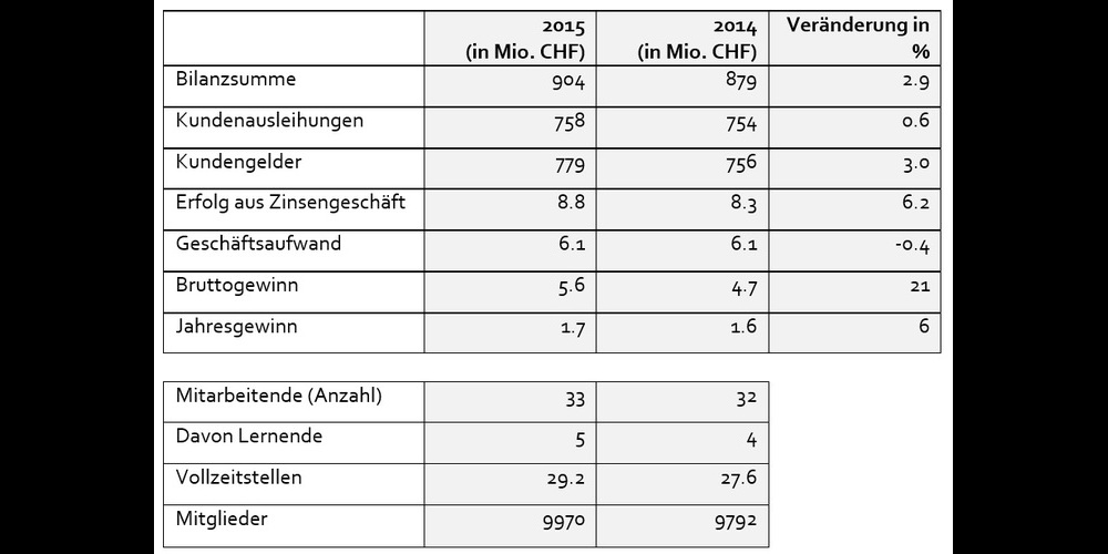 Trotz anspruchsvollem Marktumfeld können Verwaltungsratspräsident Christof Oswald und Bankleiter Aldo Kopp von einem guten Geschäftsergebnis für das vergangene Jahr berichten. Mit einem Bilanzsummenwachstum von 2.9% wurde erstmals die 900 Millionen-Grenze überschritten und 178 Personen werden neu als Mitglieder der Bank gezählt (9970 insgesamt). Die beiden sind erfreut über die Tatsache, dass der Bruttogewinn von 4.7 auf 5.6 Mio. CHF ausgebaut werden konnte. Dies dank Zuwachs in sämtlichen Positionen der Erfolgsrechnung, insbesondere im Handelsgeschäft, sowie auch im Kommissions- und Dienstleistungsgeschäft, dessen Erträge weitgehend auf dem erfolgreichen Anlage- und Versicherungsbereich der Bank beruhen.