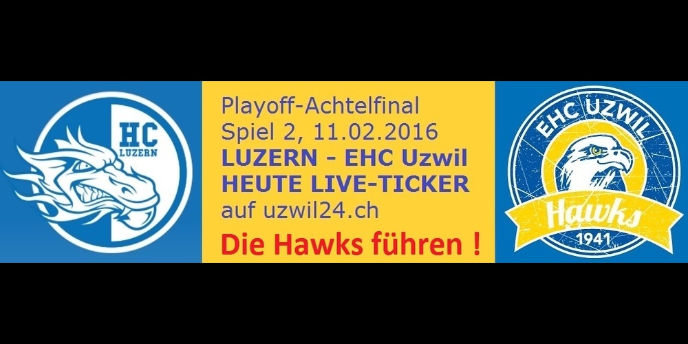 Am Donnerstagabend, 11. Februar 2016, fand der EHC Uzwil die richtige Antwort auf die knappe 3:4-Niederlage im ersten Spiel des Playoff-Achtelfinals. In der Höhle der Drachen, im Luzerner Eiszentrum, kanterten die Hawks den HC Luzern klar und deutlich mit 6:1 (2:0, 2:0, 2:1) nieder und glichen die Playoff-Serie zum 1:1 nach Spielen aus. Am Samstag folgt Spiel 3 in der Uzehalle.
