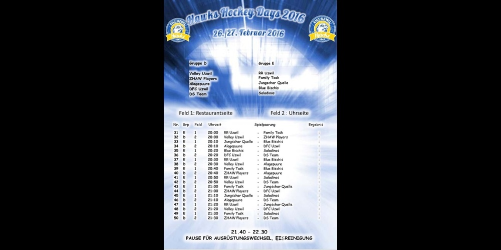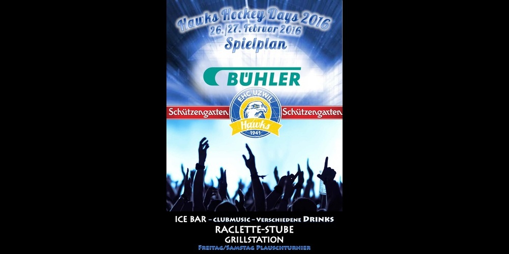 Die letzten Vorbereitungen laufen für die Hawks Hockey Days vom 26. und 27. Februar, welche der EHC Uzwil auch dieses Jahr organisiert. Am Freitag, 26. Februar 2016, steht das Bühler Turnier auf dem Programm, am Samstag, 27. Februar das offenen Plauschturnier. 55 Mannschaften nehmen daran teil. Für unterhaltsame Eiszeiten und gute Stimmung ist gesorgt. Los geht's am Freitag um 18:00 Uhr und am Samstag um 15:00 Uhr. Hier finden Sie sämtliche Spielpläne.