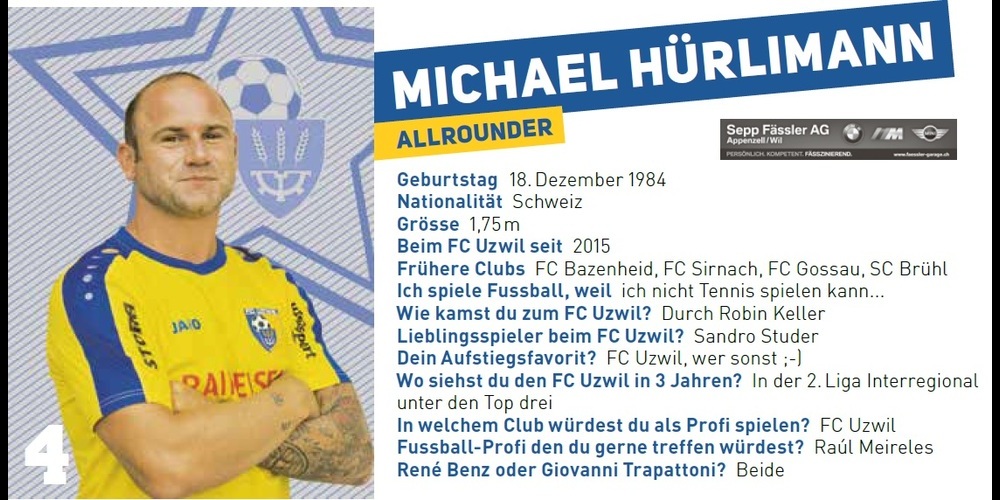 Mit 34 Punkten aus 22 Spielen steht der Aufsteiger FC Uzwil auf dem guten 7. Tabellenrang und hat sich damit den Ligaerhalt - früher als man vor Saisonbeginn hätte erwarten dürfen - souverän gesichert. Zum Rückrundenstart wartete man gar mit einer formidablen Siegesserie auf. Zuletzt folgte eine kleine Delle mit drei, teils unglücklichen Niederlagen. Jetzt gilt es, sich wieder auf die eigenen Stärken zu besinnen und auf die Siegerstrasse zurückzukehren. Tabellennachbar FC Freienbach ist zwar ein harter Brocken und zeigte sich zuletzt in sehr guter Form, dürfte aber für die Uzwiler in Reichweite liegen. Das Spiel wird am Samstag, 14. Mai 2016, um 17:00 Uhr auf dem Sportplatz Rüti, Henau/Uzwil angepfiffen. - Uzwil24 stellt heute vor: Michael Hürlimann, Allrounder.