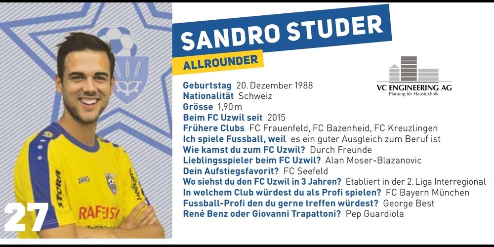 Zur drittletzten Partie der Saison 2015/16 reist der FC Uzwil am Samstag, 21. Mai 2016, zum FC Frauenfeld, wo der Anpfiff um 16:00 Uhr erfolgen wird. Gegen den Tabellenzweiten aus der nahen Thurgauer Hauptstadt ist der FC Uzwil keineswegs chancenlos. Ein Aufwärtstrend punkto Form, Siegeswillen, Konzentration und auch Schlachtenglück, kombiniert mit dem wieder erstarkten Glauben der Spieler an ihre überdurchschnittlichen Fähigkeiten, kann die zuletzt verstopfte Uzwiler Tormaschine wieder zum Laufen bringen. Idealerweise wieder mal mit einem frühen Tor für den FC Uzwil! - Uzwil24 stellt heute vor: Sandro Studer, Allrounder.