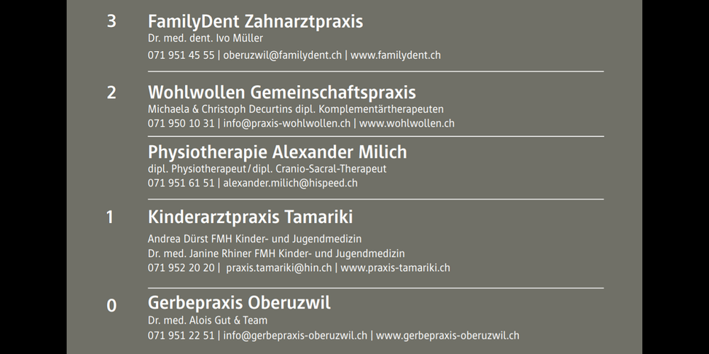 In der Wohlwollen Gemeinschaftspraxis bieten Michaela und Christoph Decurtins verschiedene Körper- und Mentaltherapien an, aber auch Gesundheits-Coaching, Personaltraining und Mentaltraining für Sportlerinnen und Sportler.FamilyDent Zahnarztpraxis