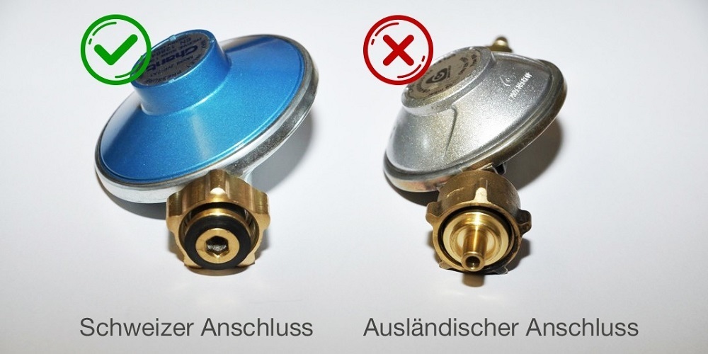 Eine grosse Gefahrenquelle beim Umgang mit Gasgrills sind Anschlüsse, welche nicht zum Grill passen. Meist ist dies auf nicht zusammenpassenden Gasflaschen und Druckregler zurückzuführen. So passen beispielsweise deutsche Druckregler oft nicht zu Schweizer Gasflaschen. Bei einer undichten Verbindung treten Gase aus und können mittels offenem Feuer oder einem Funken zu Explosionen führen. Deshalb sind ausländische Druckregler an Gasgrills meist nicht mit den in der Schweiz gehandelten Gasflaschen kompatibel.