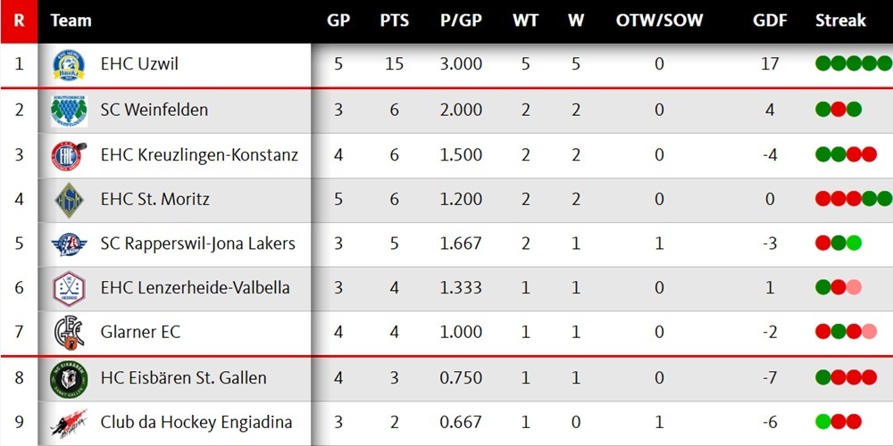 Die aktuelle Tabelle der 2. Liga OS, Gruppe 1: ein prächtiger "Streak" für die Hawks mit fünf Siegen en-suite.