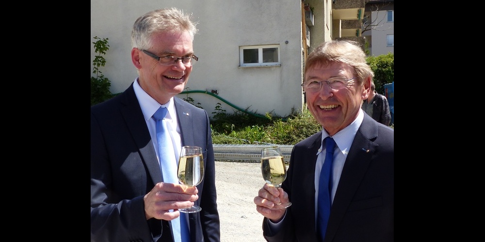 Heinz Jost (rechts) und Adrian Müller anlässlich der Grundsteinlegung des CBO-Neubaus.Rücktritt von Heinz Jost
