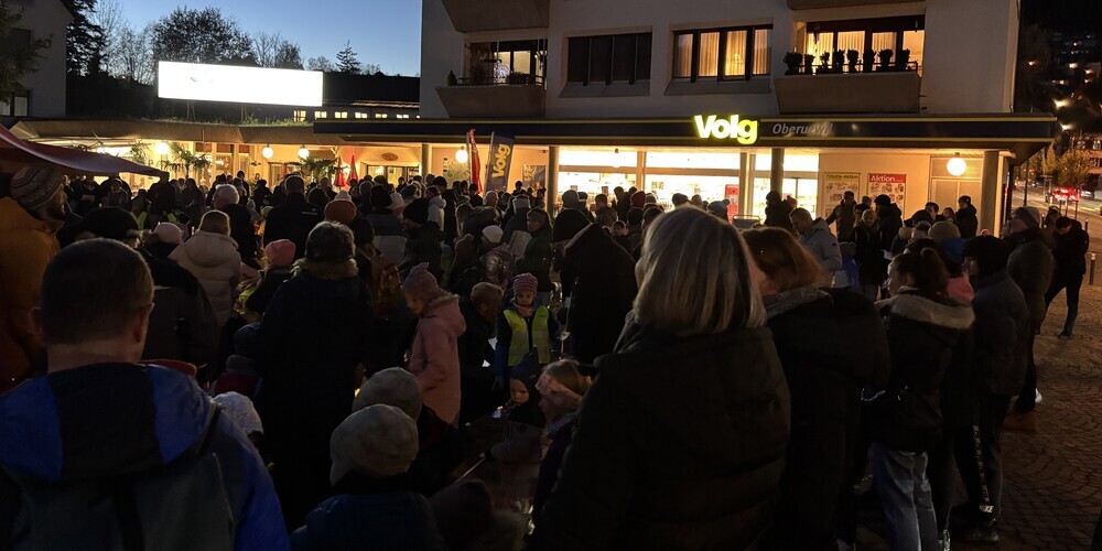 Zahlreiche Kinder mit ihren Eltern versammelten sich am Mittwoch, 5. November 2025, auf dem Dorfplatz in Oberuzwil, um am traditionellen Räbelichtliumzug teilzunehmen.