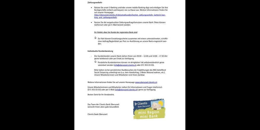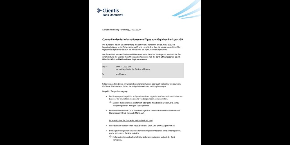 Die Clientis Bank Oberuzwil informiert Kundschaft und Bevölkerung über Anpassungen bei den Öffnungszeiten und gibt eine Reihe von Tipps für das tägliche Bankgeschäft.