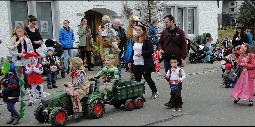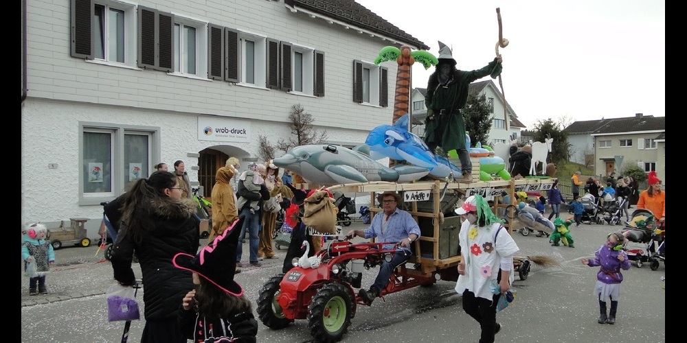 (LN) Um 14:15 Uhr fällt der Startschuss für den Dorfumzug. Die Umzugsteilnehmer versammeln sich wie immer bei der Hartachstrasse. Angeführt von den Glattburgfägern zieht der Tross Richtung Dorfmitte und anschliessend zum Schulhaus Brühlacker.