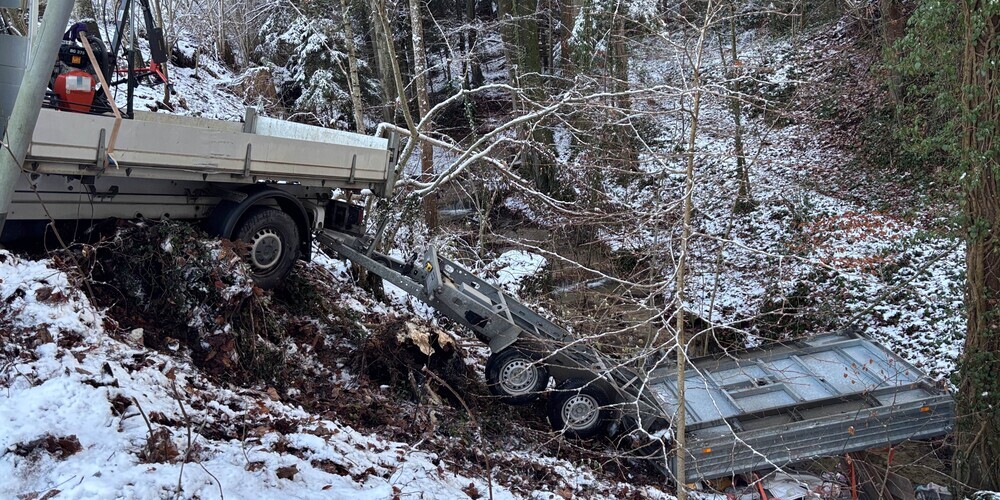 Ein 46-jähriger Mann fuhr mit seiner Fahrzeugkombination, bestehend aus einem Lieferwagen mit angehängtem Anhänger, auf der Oberdorfstrasse in Richtung Eppenberg. In der starken Steigung verlor das Fahrzeug die Traktion und rutschte Rückwärts. Der Lieferwagen kam ab der Fahrbahn und verkeilte sich an einer Strassenlaterne. Ein Teil des mit Zementsäcken beladene Anhänger löste sich und stürzte einen Abhang hinunter in den Bach. Es entstand Sachschaden von über 10'000 Franken. Ein Teil des Zements gelangte in den Gräppelenbach. Gemäss ersten Erkenntnissen kam es zu keiner Beeinträchtigung des Wassers und von Lebewesen. Die Situation wird jedoch weiter beobachtet.
