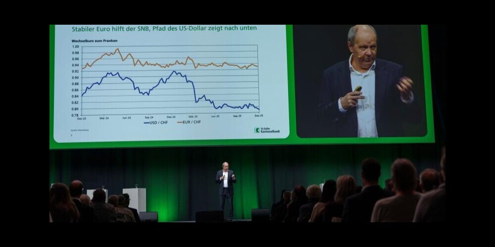 Thomas Stucki, Anlagechef der St.Galler Kantonalbank, präsentierte die Zinsaussichten für das Jahr 2026: «Die Nationalbank bleibt beim Leitzins von 0.0%.» Laut Stucki hat die SNB trotz der tiefen Inflation keinen Grund, den Schritt zu Negativzinsen zu machen. Der Franken werde zum US-Dollar, welcher von der Unsicherheit bezüglich der Unabhängigkeit der Fed belastet wird, zwar teurer. Aus Sicht der SNB wiege die höhere Inflation im Ausland die Stärke des Frankens aber auf. Für eine Zinserhöhung sei das Wachstum der Schweizer Wirtschaft 2026 aber noch zu schwach, so Stucki. «Die tiefen Zinsen halten die Nachfrage nach Immobilien hoch, vor allem von institutionellen Investoren.»