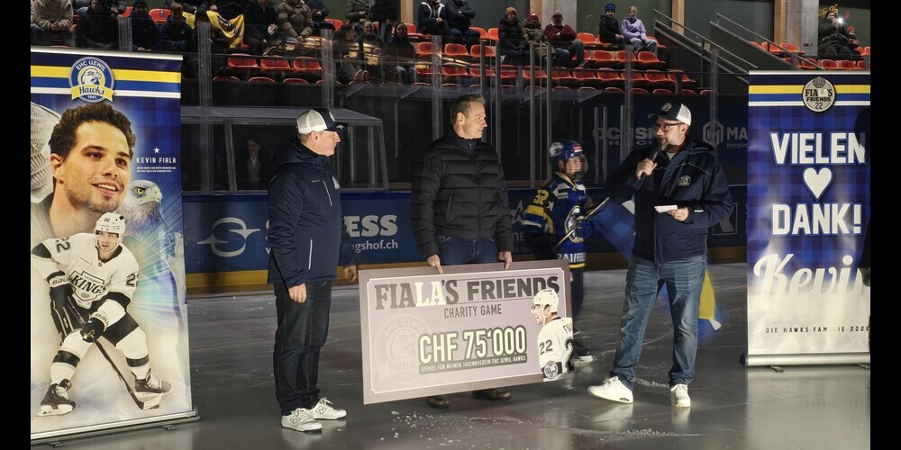 Die Überraschung war auch für die Verantwortlichen gross, als sie vor dem Spiel den Check in der Höhe von CHF 75'000 entgegennehmen durften. Wie kam es dazu? Im August 2025 hatte der NHL-Crack Kevin Fiala im Rahmen eines Charity Games, zu dem er befreundete Spieler einlud, Geld für das Kinderspital St.Gallen und für die Nachwuchsabteilungen seiner beiden Ausbildungsvereine EHC Uzwil Hawks und ZSC gesammelt. Davon kann nun auch der EHC Uzwil profitieren. Der beste Dank dafür geht an Kevin Fiala und seine Familie.