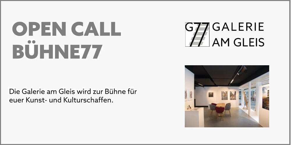 Während der Bühne77 zeigt die Galerie die Ausstellung «Artefakte – Rückblick und Ausblick» von Claire Lieberherr. Der Open Call richtet sich an Auftritte und Darbietungen, die in einer fest installierten Ausstellung stattfinden können.