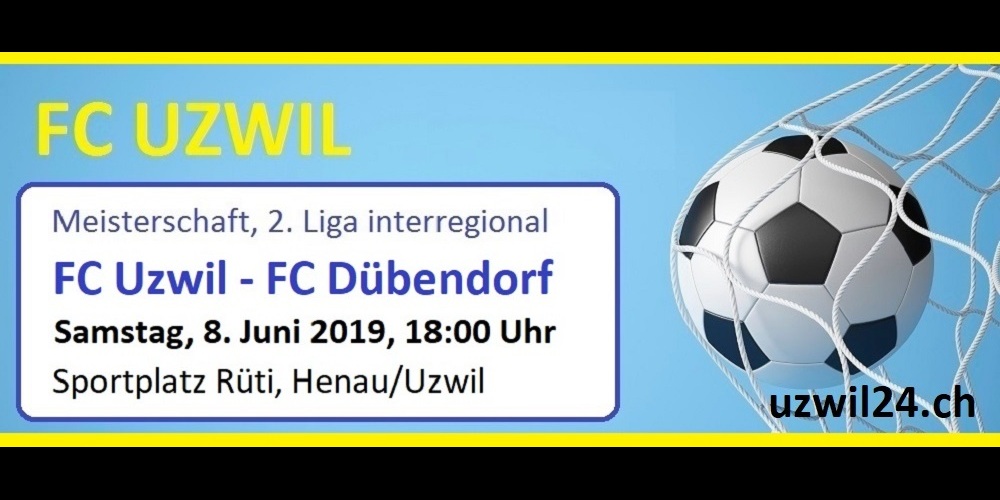 Am Samstag, 8. Juni 2019, empfängt der FC Uzwil zum letzten Heimspiel der Saison 2018/19 den FC Dübendorf auf der Sportanlage Rüti, Henau/Uzwil. Anpfiff ist ausnahmsweise um 18:00 Uhr, da alle Partien der 2. Liga interregional, Gruppe 6, aus Fairnessgründen gleichzeitig gespielt werden; bei einigen Teams geht es noch um den Auf-, bzw. Abstieg. - Der FC Uzwil 2 spielt in Wängi, sollte dort 1 Punkt holen oder zumindest keine gelbe oder rote Karte kassieren. Dann ist der Ligaerhalt aus eigener Kraft geschafft.
