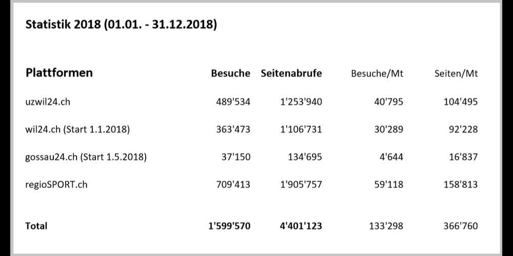 Auch der Blick auf die Statistik zeigt ein erfreuliches Bild. Mit 1,6 Millionen Besuchen und über 4,4 Millionen Seitenabrufen auf unseren Portalen brach das Jahr 2018 sämtliche Rekorde und widerspiegelte den klaren Trend zu Online-Medien auch im Lokaljournalismus. Ein Trend, den auch die Gemeinden, Parteien, Vereine und Firmen erkannt haben und mittragen. Zum Vorteil für alle Partner und mit dem Wohl der Gemeinschaft im Fokus.