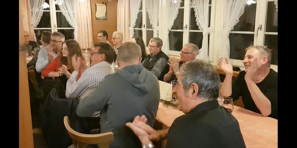 Rund ein Drittel der Teilnehmenden war aus dem Dorf Jonschwil hinauf auf den Wildberg marschiert, wo das beliebte Ausflugsrestaurant trotz "Winterferien" für die SVP geöffnet hatte. Als neutraler Beobachter konnte man schnell die gute Stimmung feststellen und die Freude daran, sich vor Weihnachten nochmals zu treffen. Ortspräsident Peter Haag kündigte nach der Begrüssung der Mitglieder und Gäste den ebenfalls noch eintreffenden Ehrengast Mike Egger an und sorgte damit für viel Applaus. Mike Egger gab im Laufe des Abends einen Rückblick auf seine politische Karriere, die ihn nun im Alter von erst 26 Jahren bereits "nach Bern" brachte. Er dankte für die Einladung und bat um Unterstützung bei den im kommenden Jahr beginnenden Wahlen auf nationaler, kantonaler und kommunaler Ebene. Ein besonderes Geschenk erhielt Mike Egger abschliessend von der SVP Jonschwil-Schwarzenbach in Form eines Live-Vortrags der Jonschwiler "Hymne" (im Clip weiter unten).