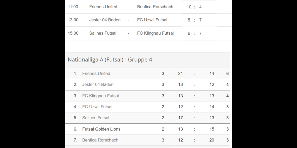 Am nächsten Sonntag, 2. Dezember 2018, trifft der FC Uzwil Futsal um 11:00 Uhr auf den Geheimfavoriten aus Möhlin, Salines Futsal, und zwar in der Betoncoupe Arena in Schönenwerd. Dank des Erfolgserlebnisses gegen Baden werden die "AllBlacks" diese schwierige Aufgabe mit viel Selbstvertrauen angehen können.