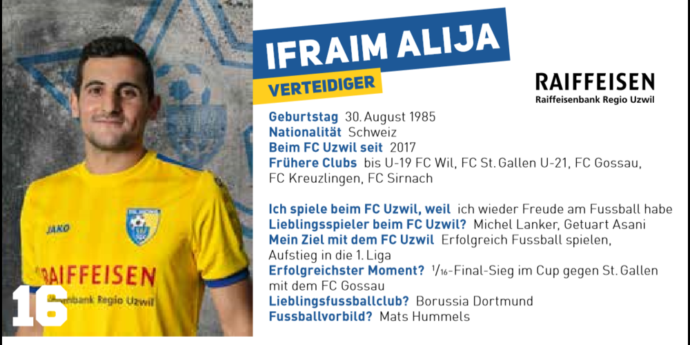 Der FC Uzwil spielt am Samstag, 20. Oktober 2018, vor eigenem Publikum gegen den punktgleichen FC Blue Stars aus Zürich. Die Partie wird um 17:00 Uhr auf der Sportanlage Rüti, Henau/Uzwil angepfiffen. Das Team von Cheftrainer Sokol Maliqi will wieder einmal einen Dreier auf dem Punktekonto verbuchen. - Wir stellen heute vor: Ifraim Alija, Verteidiger.