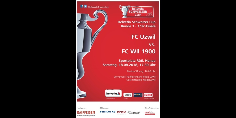 Es ist soweit! Seit dem 30. Juli 2018 läuft der Ticket-Vorverkauf für die Partie im Helvetia Schweizer Cup FC Uzwil gegen den FC Wil 1900 vom Samstag, 18. August 2018, auf der Sportanlage Rüti, Henau. Der Preis für Kinder von 6 bis 16 Jahren ist 8 Franken, für Erwachsene 18 Franken.