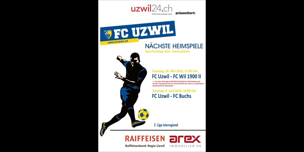 Am Samstag, 26. Mai 2018, grilliert das Fanionteam des FC Uzwil, inklusive Staff und Vorstand, von 09:30 Uhr bis 16:00 Uhr für die Bevölkerung der Region Uzwil beim ALDI Niederuzwil. Die Einnahmen gehen vollumfänglich in die Vereinskasse des FC Uzwil. Am Abend kann der FC Uzwil dann auch noch brillieren. Er spielt vor eigenem Publikum auf der Sportanlage Rüti, Henau/Uzwil gegen den Lokalrivalen aus Wil. Anpfiff ist um 17:00 Uhr.