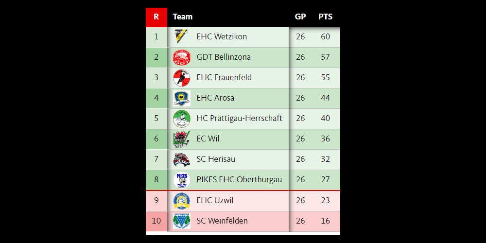 Die gleichen Teams starten danach in die Abstiegsrunde (Playouts), wo nach dem Modus "Best-of-Five" der Absteiger in die 2. Liga ausgemacht wird. Oder positiv: Wer in den Playouts zuerst drei Spiele gewonnen hat, bleibt in der 1. Liga. Der EHC Uzwil hat dabei immerhin den Vorteil, dass er als Zweitletzter der Tabelle zum Auftakt der Playouts Heimrecht geniessen wird.
