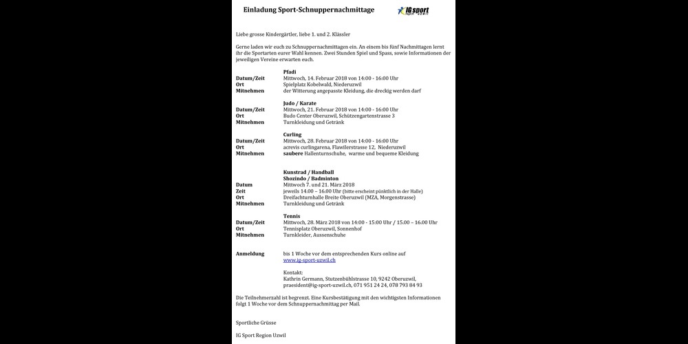 Die Interessengemeinschaft der Sportvereine aus der Region Uzwil - die IG Sport Region Uzwil - lädt auch 2018 ein zu Sport-Schnuppertagen. Angesprochen werden die grossen KindergärtlerInnen sowie alle 1.- und 2.KlässlerInnen. An mehreren Mittwochnachmittagen können Interessierte die Pfadi und verschiedene Sportarten kennenlernen, darunter Judo, Karate, Curling, Kunstrad, Handball, Badminton, Shozindo und Tennis.
