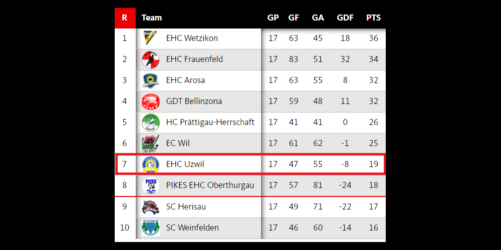 Ein Blick auf die Tabelle (weiter unten) zeigt, dass Uzwil im Vergleich zu den direkten Konkurrenten um die Playoffplätze zahlreiche Spiele nur knapp verloren hat (Tordifferenz nur -8). Auf der anderen Seite ist offensichtlich, dass einfach zu wenig Tore erzielt werden. Es ist zu hoffen, dass die Ladehemmung in den beiden Derbys gegen den EC Wil gelöst werden kann.
