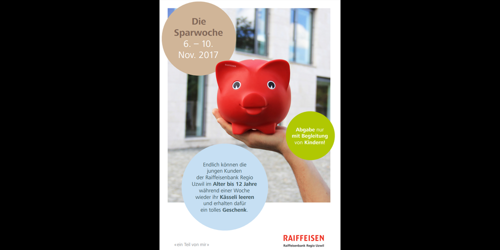 Die Raiffeisenbank Regio Uzwil führt vom 6. bis 10. November 2017 in den vier Geschäftsstellen Oberbüren, Niederuzwil, Niederbüren und Schwarzenbach die beliebte und traditionelle Sparwoche durch. Die jugendlichen Kunden, im Alter bis zwölf Jahren, können ihre „Kässeli“ leeren und werden von der Bank für ihren eifrigen Sparwillen mit einem Geschenk nach Wahl belohnt.