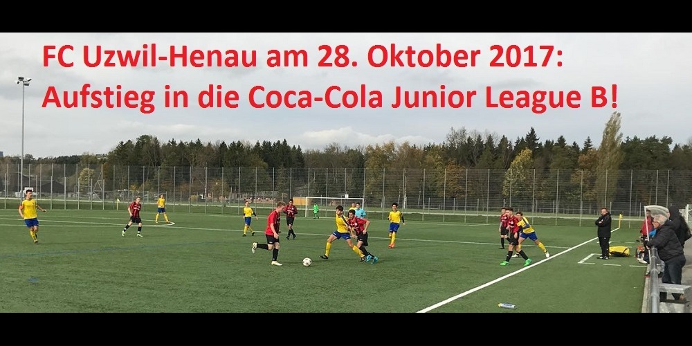 Wir gratulieren! Den B-Promo Junioren von Trainer Raffi Palmiero ist am 28. Oktober 2017 der Aufstieg in die Coca Cola Junior League B gelungen - die höchste B-Juniorenliga der Schweiz. Das kombinierte Team FC Uzwil-Henau gewann am Samstagnachmittag auf dem Sportplatz Rüti, Henau/Uzwil, gegen den FC Herisau mit 5:1 und überholte damit im Fernduell den punktgleichen FC Zuzwil, der praktisch zeitgleich beim SC Aadorf eine 2:3-Niederlage einstecken musste.