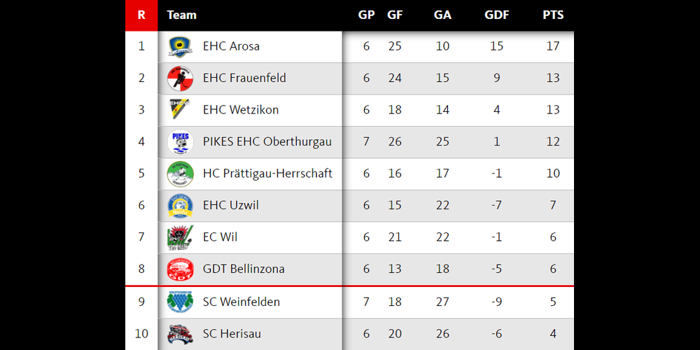 Die Bünder liegen mit 10 Punkten aus 6 Spielen einen Platz vor dem EHC Uzwil, der mit 7 Punkten auf dem guten 6. Rang platziert ist. Prättigau-Herrschaft ist unter dem langjährigen Coach Dusan Halloun gut in die neue Saison gestartet. Sie verzeichneten Siege gegen Frauenfeld (OT), Herisau (SO), Bellinzona und Wil und gingen gegen die PIKES EHC Oberthurgau und den SC Weinfelden (in Grüsch 1:4) als Verlierer vom Eis.