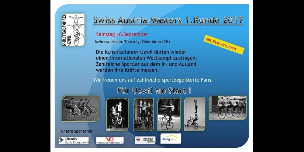 Der Verein Kunstradfahren Uzwil veranstaltet am Samstag, 16. September 2017, in der Thurzelg-Mehrweckhalle, Oberbüren, den ersten Durchgang der dreiteiligen Swiss-Austria Masters 2017. Dabei treffen die besten Kunstradfahrerinnen und -fahrer aus der Schweiz, Österreich und anderen europäischen Ländern aufeinander. Teilnehmende und Organistoren freuen sich auf den Besuch zahlreicher Anhänger aus der Region Uzwil.