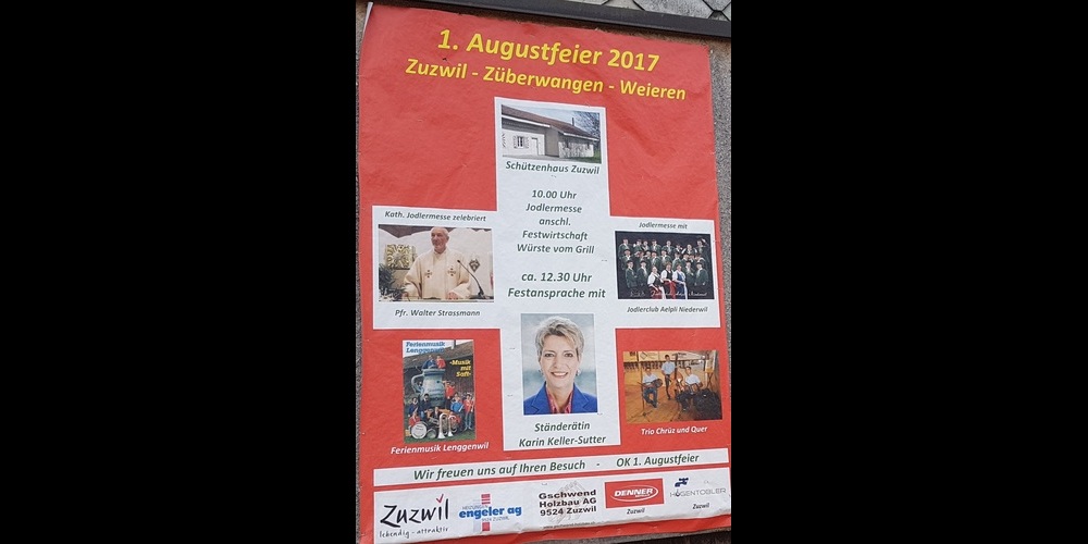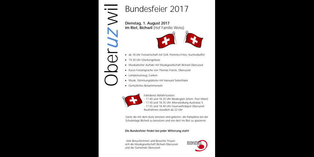 Zeit: 1. August 2017, ab 18:00 Uhr Ort: im Riet, Bichwil (Hof der Familie Weiss) Festansprache: Thomas Franck, Oberuzwil Plakat: