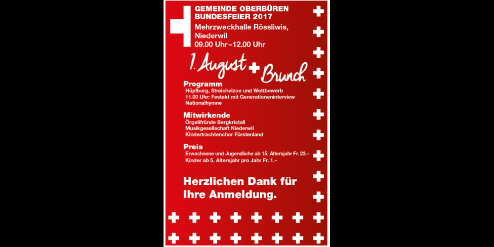 Zeit: 1. August 2017, 9:00 - 12:00 Uhr Ort: Mehrzweckhalle Rössliwis, Niederwil Plakat: