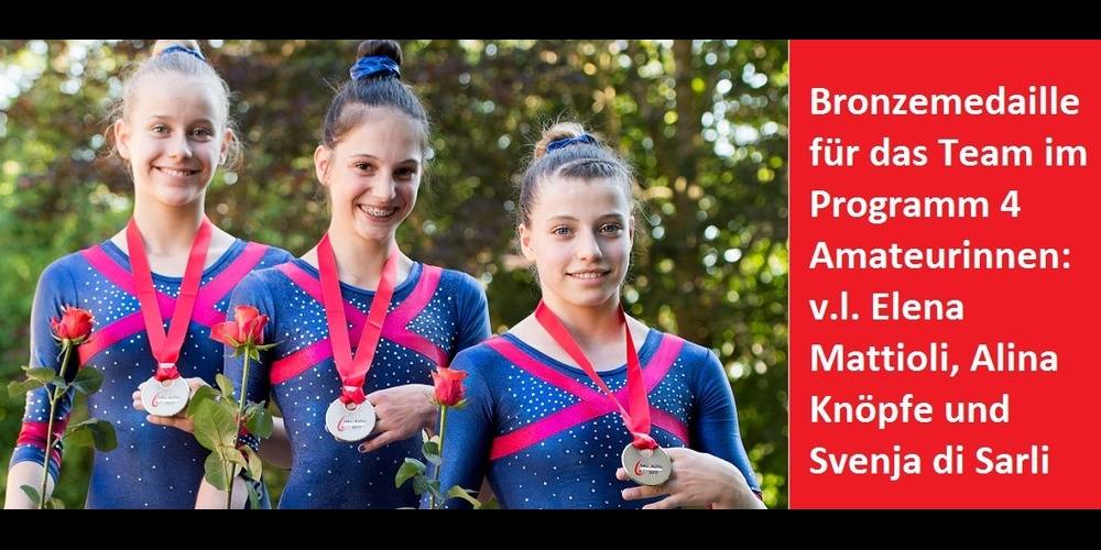 Auch im Programm P4 Amateurinnen wurden die Erwartungen erfüllt. Acht Turnerinnen des TZFF waren am Start; mit dem Diplom von Alina Knöpfel und dem 3. Rang im Team konnte man sehr zufrieden sein. Alina Knöpfel (TV Lütisburg), Svenja Di Sarli (STV Bernhardzell) und Elena Mattioli (STV Flawil) gewannen zum ersten Mal eine Medaille an Schweizer Meisterschaften.
