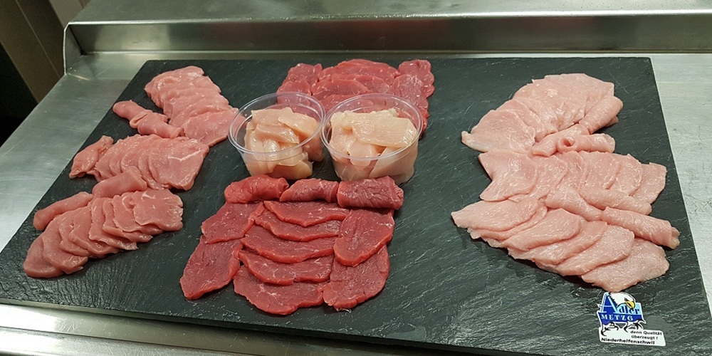 Gemäss Philipp Krucker ist die Vor- und Zubereitung besonders wichtig, um erstklassige Qualität garantieren zu können: "Die Edelstücke werden seit Oktober gelagert, nicht gefroren und jetzt von Hand geschnitten." Die Kundinnen und Kunden bevorzugen das Standard-Angebot mit Rinds-, Kalbs-, Schweine- und Pouletfleisch. "Aber auch die Exoten wie Strauss-, Truten-, Pferd- oder Lammfleisch werden nachgefragt", ergänzt Krucker und fährt fort: "Dazu gibt es verschiedene Saucen, die nebst Beilagen auch zum Fondue Chinoise gehören".