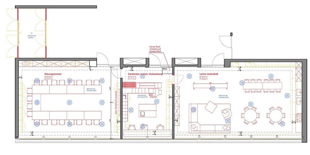 In einem separaten Sitzungsraum, dem bisherigen Lehrerzimmer mit einer Fläche von 65 m2, soll künftig ungestört gearbeitet werden können. Diese Möglichkeit fehlt heute. Das Zimmer soll für Konvente, Arbeitssitzungen in Unterrichtsteams, Besprechungen in Gruppen oder für bilaterale Absprachen genutzt werden. Dies ist im «Lehrerzimmer», welches vor allem für Pausen, Verpflegung und Erholung genutzt wird, auch aufgrund der Geruchs- und Lärmemissionen, nicht möglich. Nicht zu vergessen sind jene Lehrpersonen, welchen kein eigenes Schulzimmer zur Verfügung steht. Im Rahmen der Schulentwicklung nimmt das kollaborative Arbeiten zwischen den Lehrpersonen einen immer höheren Stellenwert ein.