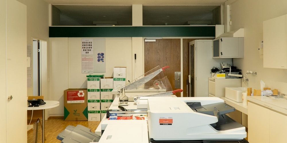 Der bestehende Vorbereitungsraum mit einer Fläche von 30 m2 ist künftig von den beiden grösseren Räumen her zugänglich und dient künftig auch als Garderobe. Für die Verbindung und die veränderte Nutzung sind ein Mauerdurchbruch sowie das Versetzen eines IT-Racks und eines Lavabos notwendig. Die Plätze zum Kopieren, Schneiden, Binden, Lagern werden neu angeordnet. Das Fensterbrett wird als Arbeitsfläche verwendet. Alle Räume sind sowohl vom Gang als auch untereinander zugänglich, was kurze Wege und praktische Abläufe ermöglicht.