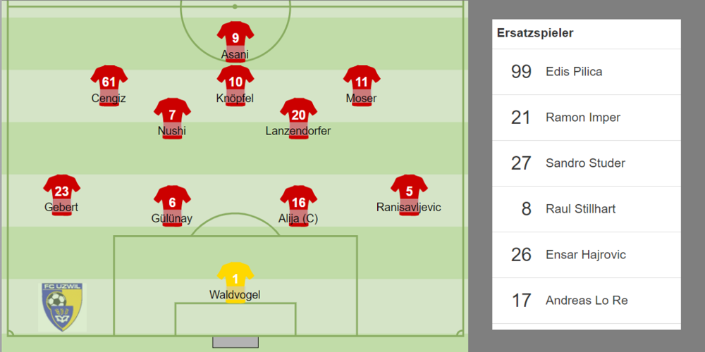 9. Minute: Der FC Uzwil geht durch Getuart Asani 1:0 in Führung. Nachdem er bereits in der 6. Minute per Kopfball den Pfosten getroffen hat, trifft er jetzt nach Kopfballvorlage von Fabio Moser ebenfalls mit dem Kopf unhaltbar für den Gossauer Hüter Geiser ins Tor.