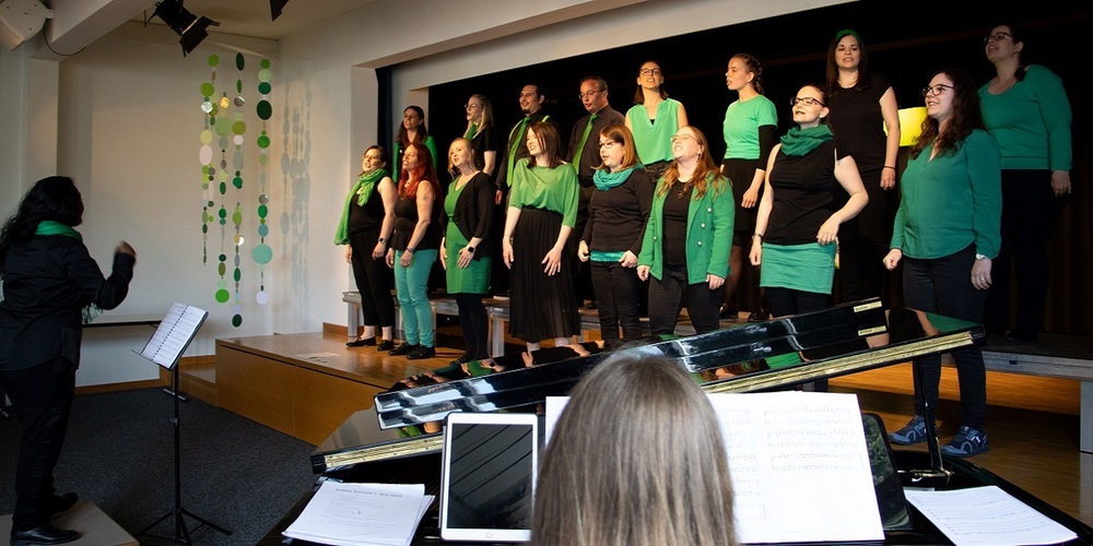 Denn für die Sängerinnen und Sänger war es ein Heimspiel: Nur zwei Stockwerke unter ihrem Probenort präsentierten sie ihr Können vor den versammelten Freunden und Familienmitgliedern.