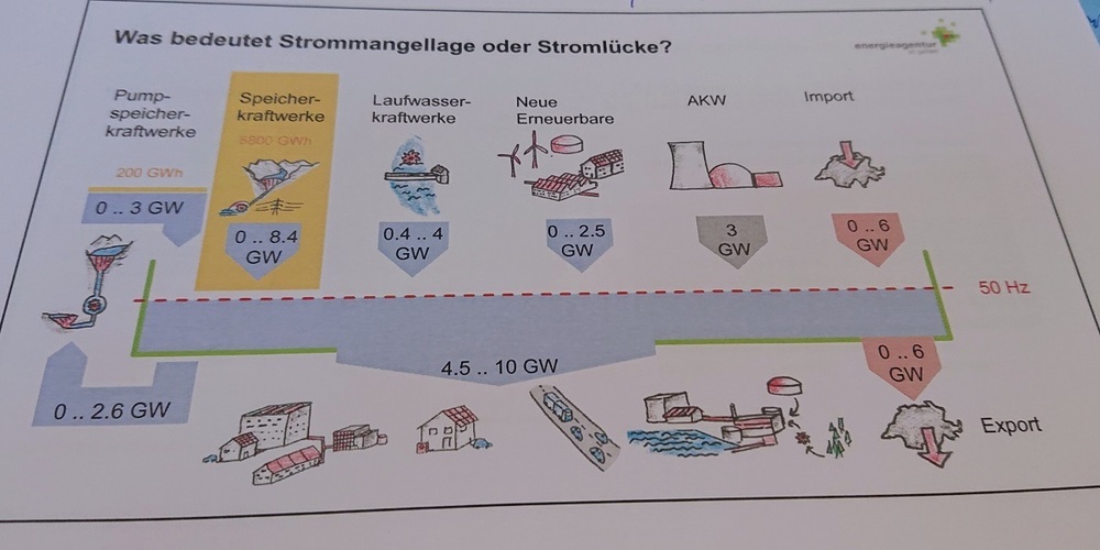 Christian Eisenhut von der Energieagentur St. Gallen gab einen Überblick über die Faktenlage, erläuterte die Aussagen mehrerer Studien und gab den Teilnehmenden vier Leitsätze mit, die mithelfen können die Herausforderung eines Stromengpasses aufgrund der nach wie vor bestehenden Auslandabhängigkeit schrittweise abzubauen. Die medial stark aufgekochte Winterstromlücke im Jahre 2025 kann gemäss Eisenhut nicht ausgeschlossen werden. Mit einem breiten Spektrum von Massnahmen in der Stromproduktion und -speicherung (Stichwort: Diversität auch bei Energiequellen) und mit der Reduktion des Strom- bzw. Energieverbrauchs (Stichworte: Gebäudeisolation, Carsharing) können wir alle aber etwas dagegen unternehmen. Nicht nur die Politik, auch Private und Firmen seien jetzt am Ball. Die Entwicklung der letzten Jahre habe dazu geführt, dass PV-Anlagen die günstigste Art der lokalen Stromproduktion geworden seien.