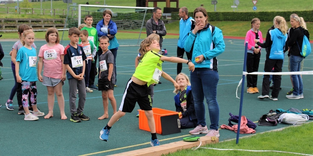 Auf der Sportanlage des Oberstufenzentrums Sproochbrugg beteiligten sich 125 Mädchen und Jungen im Alter von sieben bis fünfzehn Jahren am Leichtathletik-Dreikampf des UBS-Kids-Cup. Die Wetterbedingungen für den Sportnachmittag waren zwar nicht optimal, aber grösstenteils trocken. Rund 30 Helferinnen und Helfer unterstützten die OK-Chefin Regina Petzold. Auf den drei Wettkampfplätzen der Disziplinen 60m-Sprint, Weitsprung und Weitwurf mit Ball waren sie für die Zeit- und die Weitenmessung verantwortlich. Mit gestaffeltem Einsatz und einstündigem Abstand traten die Teilnehmenden der verschiedenen Alterskategorien zum Wettkampf an, sodass eine Massierung der Kinder und Begleitender ausblieb. Auch die Rangverkündigungen wurden in jeder Kategorie separat durchgeführt. Weil am gleichen Nachmittag beim Tag der offenen Tür die Besichtigung des sanierten Lernschwimmbeckens für die interessierte Bevölkerung stattfand, herrschte in der Festwirtschaft auf dem Pausenplatz Hochbetrieb.