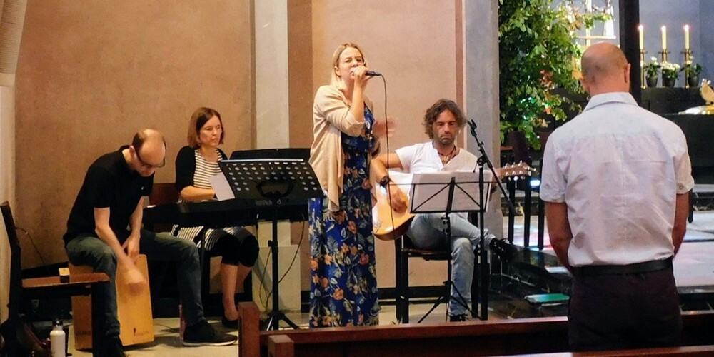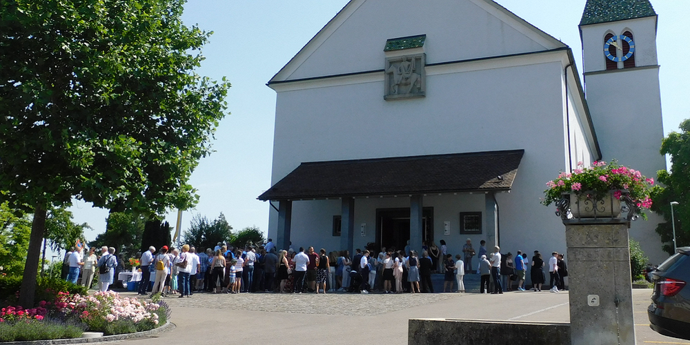 Im Anschluss an den feierlichen Gottesdienst, zu dem auch MusikerInnen der Gruppe von Sabrina Bachmann beitrugen, bot sich Gelegenheit zum Gespräch. Aufgrund der hohen Temperaturen wurde aber zuerst der Durst am Apéro-Buffet gelöscht. Auch auf dem Kirchplatz kamen die Feiernden in den Genuss musikalischer Unterhaltung; dafür sorgte die beliebte Musikantengruppe Schwarzenbach.