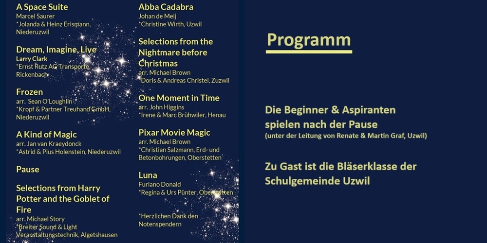 Beim diesjährigen Konzert der Jugendmusik Uzwil erwartet die Zuhörer ein musikalisches Programm voller Magie. Es werden Klassiker wie "One Moment In Time" und die Filmmusik von "Harry Potter und der Feuerkelch" gespielt. Darüber hinaus präsentiert das Corps auch Stücke, die es beim Eidgenössischen Jugendmusikfest in St. Gallen aufgeführt hat, sowie viele weitere zauberhafte Melodien.