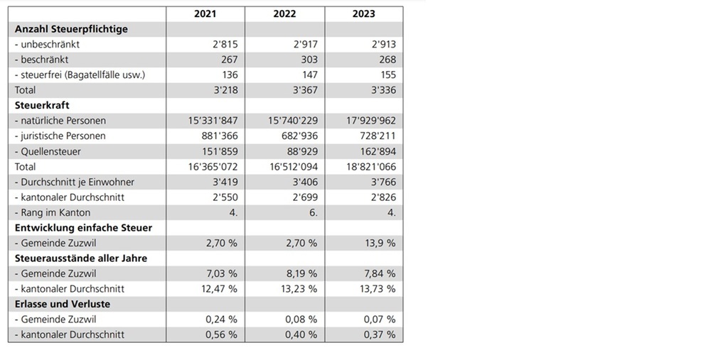 Das kantonale Steueramt hat die Kennzahlen zum Steuerwesen publiziert. Diese geben Auskunft über die Entwicklung der einfachen Steuer sowie über die Steuerkraft von natürlichen und juristischen Personen. Sie ermöglichen einen Vergleich mit dem kantonalen Mittel. Zuzwil steht diesbezüglich weiterhin gut da.