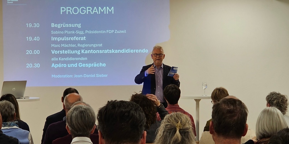Sabine Plank, FDP Präsidentin der FDP Zuzwil, begrüsste die Teilnehmenden im Gemeindesaal der Sporthalle Zuzwil und dankte für das Interesse. Vor den persönlichen Gesprächen und Diskussionen beim Apéro standen zwei Themen im Vordergrund: die kantonalen Finanzen und die Kandidierenden für den Kantonsrat aus der Gemeinde Zuzwil.