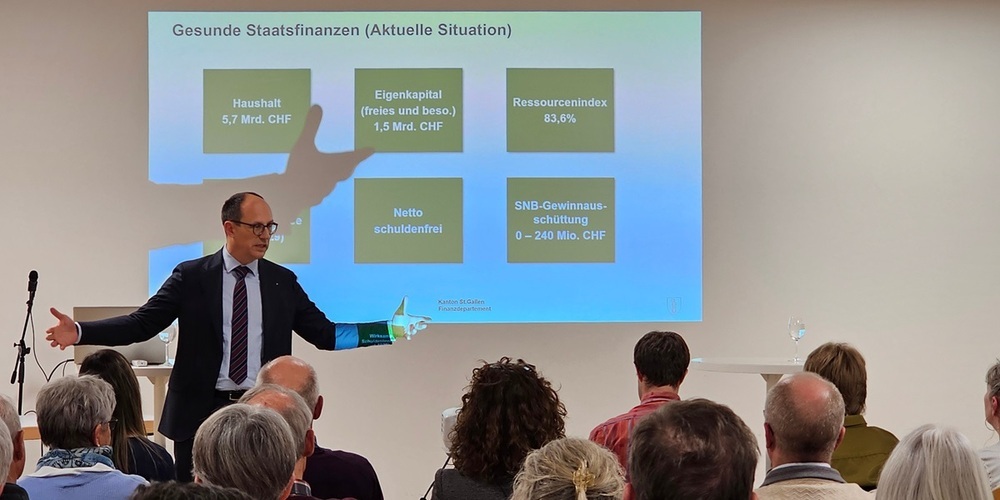 Regierungsrat Marc Mächler, der mit seiner Familie in Zuzwil wohnt, genoss das "Heimspiel" und gab einen spannenden Überblick über die gute finanzielle Lage des Kantons, die sich durch ein starkes Eigenkapital, eine hohe Liquidität und stille Reserven in den Immobilien auszeichne. Profitiert hätten davon auch die Einwohnerinnen und Einwohner durch die zwei kürzlich erfolgten Steuersenkungen. Er verwies aber auch auf die Risiken in der Bilanz, insbesondere aufgrund der Spitäler, deren Werthaltigkeit ungewiss sei.