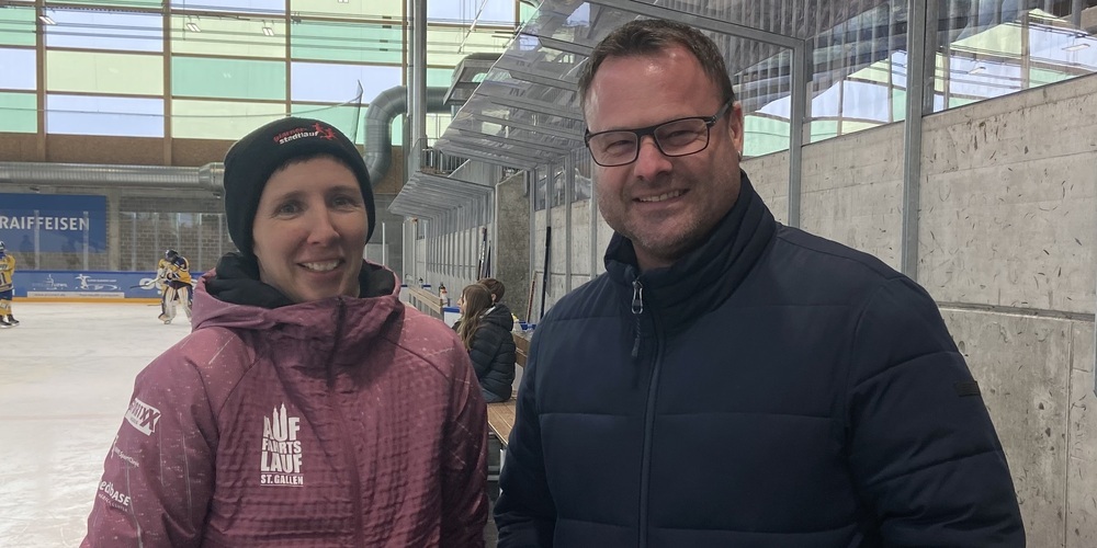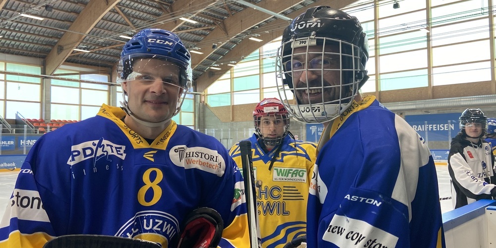 In voller Hockey-Montur und voller Vorfreude: Gilles Allenspach (Schulleiter Oberstufe Uzwil Uzeschuel, links), und Thomas Jenni (Klassenlehrperson).