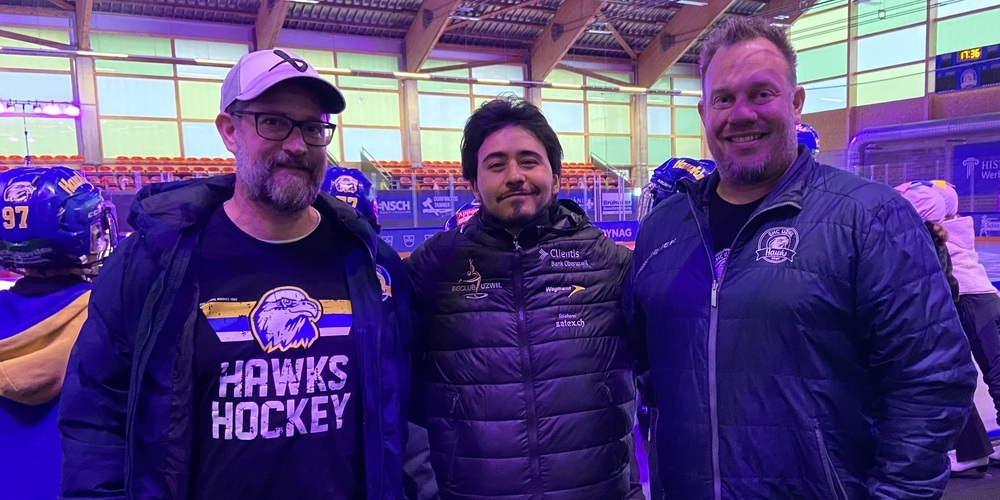 Im Bild v. l.: Philipp Herzog (Präsident EHC Uzwil), Phillip Liñan (Präsident EC Uzwil) und Patrik Hoegger (Chef Nachwuchs EHC Uzwil), die sich über die verbesserte Zusammenarbeit freuen. Beim nächsten Plauschtag wird auch der Curling Club Uzwil wieder dabei sein. Er musste diesmal passen, weil am gleichen Wochenende die internen Vereinsmeisterschaften stattfinden.